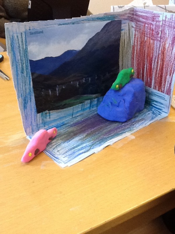 Sista momentet innan själva inspelningen är att skapa en miljö där animationen ska spelas in i.Två sidor och botten av en kartong används för att skapa kulissen. Från tidningar, färgpennor och färger dekorerades kulissen.