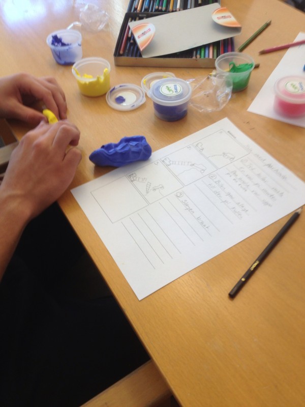 Här har deltagarna förberett sig för inspelningen, lerfigurerna som får utgöra karaktärerna och scenen. Scenen som är gjord med en kartong är tejpad på bordet för att ligga stilla under hela inspelningen. Till själva inspelningen används en iPad monterad på ett stativ.